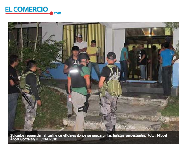 Los miembros de la IV División del Ejército las acogieron pidiéndoles tranquilidad. Inmediatamente fueron trasladadas hasta la ciudad de Lago Agrio. Las extranjeras se encontraban desorientadas en un potrero de la hacienda. Sus gritos alertaron a los Montoya. “Cuando llegamos habían colgado un trapo. Hasta habían armado unas camitas”, relataron los esposos Montoya. Los asaltos son frecuentes A la reserva habían llegado alrededor de 300 militares del Grupo de Fuerzas Especiales 53 Rayo y del Batallón 55 Putumayo. En la mañana de ayer, grupos de soldados se internaron a la zona para buscar pistas de las cautivas. Hasta ayer en la tarde, luego de casi siete horas de patrullajes, no existían rastros de las mujeres. Un testigo del secuestro y asalto, ocurrido en el ingreso a la Reserva de Cuyabeno, contó lo ocurrido a este Diario. Juan C. (nombre protegido) salió del puente de Cuyabeno, con dirección a las lagunas del mismo nombre, junto con cinco turistas extranjeros y otros dos pasajeros. Eran alrededor de las 12:45. Luego de 15 minutos de recorrido por las aguas del Cuyabeno, el viaje fue súbitamente interrumpido. Tres hombres -dos de ellos armados- obligaron a que la embarcación se detuviera. En medio de la confusión, los obligaron a llevar el bote hacia la orilla del río, mientras les apuntaban con un revólver y una cartuchera. Entonces, los llevaron a tierra y les robaron sus pertenencias. “Me quedé helado. Les hablé en inglés a los turistas para que se calmaran”, recuerda Juan C. Él calcula que el robo duró alrededor de 10 minutos. Los hombres estuvieron calmados durante el asalto e incluso conversaban con las víctimas. Les hablaban sobre su precaria situación económica. Ellos dijeron que pertenecían a Los Rastrojos. Un grupo con el mismo nombre opera en Colombia. “Mientras nos robaban, otra canoa bajó por el mismo sitio con dos turistas más. A ellos también les asaltaron”. Una vez en poder de los objetos de valor del grupo, los desconocidos embarcaron a los turistas y guías en una sola canoa. Pero, mientras bajaban al bote, los tres hombres plagiaron a dos mujeres del grupo: una australiana (de 32 años) y una británica (de 23). Las mujeres lloraban desesperadas, mientras sus compañeros se alejaban en la canoa. Esta víctima y otro motorista corrieron a pedir ayuda hasta una casa cercana. Luego se dirigieron a las oficinas del Ministerio del Ambiente (MAE), en la entrada a la Reserva Cuyabeno. Juan C. trabaja con agencias turísticas que tienen cabañas en la reserva del Cuyabeno. En febrero, él fue víctima de otro asalto ocurrido cerca del sitio donde fueron secuestradas las extranjeras. Hace seis meses, tres embarcaciones que llevaban visitantes fueron atracadas asimismo por seis armados. “Tenían armas como granadas, aunque no sé si eran falsas. Se llevaron un buen botín”. El guía lamenta que en las oficinas del MAE, no existan medios para comunicarse. Ellos intentaron informar pero no pudieron. Más detalles Tres de los turistas asaltados fueron llevados hacia Lago Agrio la noche del viernes y ayer a Quito. Dos hombres y una mujer fueron atendidos por personal que se encontraba en el sitio. Dos grupos de soldados se internaron ayer, en la mañana, en la zona para indagar posibles pistas. Además, se hicieron patrullajes aéreos sobre el sector. Se montaron retenes en el puente de Cuyabeno, en la cooperativa 16 de Abril y El Rosario (cantón Putumayo). Intervienen también policías del sector. En los patrullajes se conoció que miembros de las Fuerzas Armadas del Ecuador llegaron hasta un sitio denominado 16 de Abril, donde posiblemente encontrarían pistas de la banda.