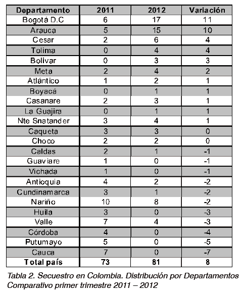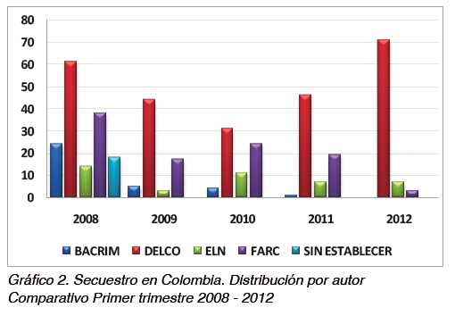 • Durante el primer trimestre de 2012 las autoridades no registraron ningún caso de secuestro atribuido a las BACRIM