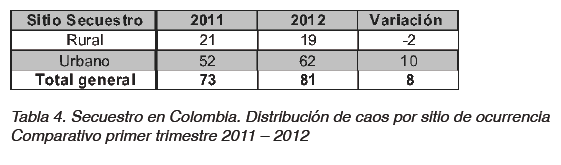 • Comparativamente con el primer trimestre de 2011, los secuestros en sectores rurales disminuyeron en 2 casos y los urbanos aumentaron en 10 registros. 3 de cada 4 secuestros en el primer trimestre de 2012 se presentaron en centros urbanos.