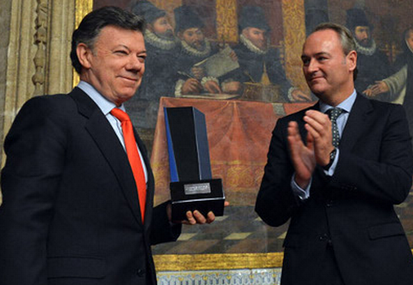 “Si quieren adelantar el cese del fuego o humanizar el conflicto, lo que queremos nosotros es finalizarlo y no humanizarlo, y entre más pronto lleguemos a un acuerdo, más pronto se silencian los fusiles, así de sencillo”, dijo Santos luego de recibir de manos del presidente de la Generalitat, Alberto Fabra, el XX Premio de Convivencia ‘Manuel Broseta’ en reconocimiento a su compromiso en la lucha contra el terrorismo, el fin del conflicto guerrillero y la búsqueda de la paz.