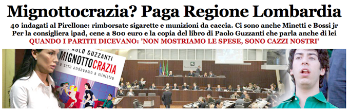 La realtà supera la fantasia. 40 consiglieri al Pirellone nel mirino della Procura con l’accusa di peculato per avere pagato dalle munizioni alle cene di lusso coi soldi pubblici, tutti giustificati come “impegno istituzionale”. Non solo. Oltre ai capigruppo Paolo Valentini del Pdl e Stefano Galli della Lega Nord, spunta tra gli indagati anche Nicole Minetti, già imputata nel processo sul caso Ruby. Fra le altre cose, l’ex igienista dentale chiede (e ottiene) il rimborso di ’Mignottocrazia‘, il libro del collega di partito Paolo Guzzanti che include un capitolo dedicato a lei. Ma c’è dell’altro. Nella lista compare anche un iPad. Forse lo usava in Consiglio regionale? Niente affatto, perché il Pirellone aveva già regalato a ciascun consigliere il tablet da centinaia di euro. Ma ci sono anche i ristoranti alla moda, 400 euro per una cena al ristorante da Giannino e consumazioni per 832 euro al Principe di Savoia, mentre sono decine gli scontrini per altre cene e taxi. E nella lista degli indagati finisce anche Renzo Bossi, il figlio del Senatur.