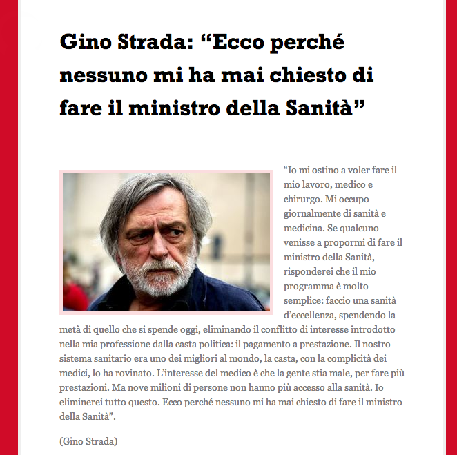 Gino Strada: “Ecco perché nessuno mi ha mai chiesto di fare il ministro della Sanità”