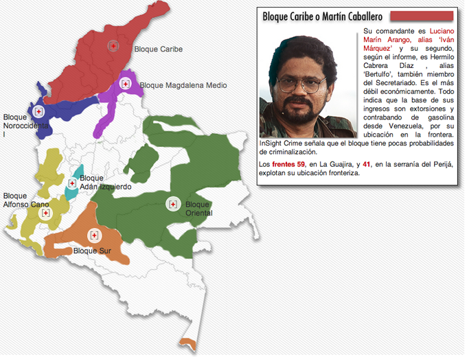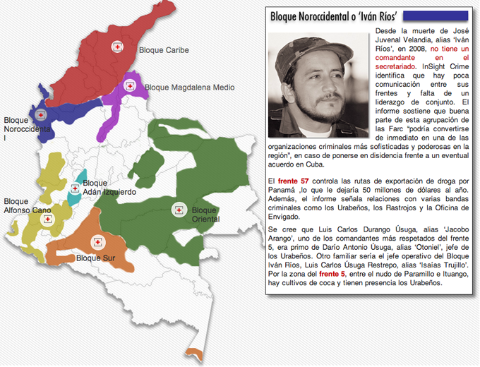 Durante el recorrido por los siete bloques y el estudio de caso del Bloque Noroccidental o ‘Iván Ríos’, que opera principalmente en los departamentos de Antioquia, Córdoba y Chocó, InSight Crime señala las relaciones de esta guerrilla con las bandas criminales.