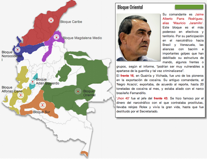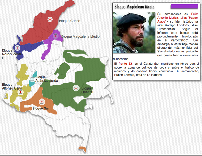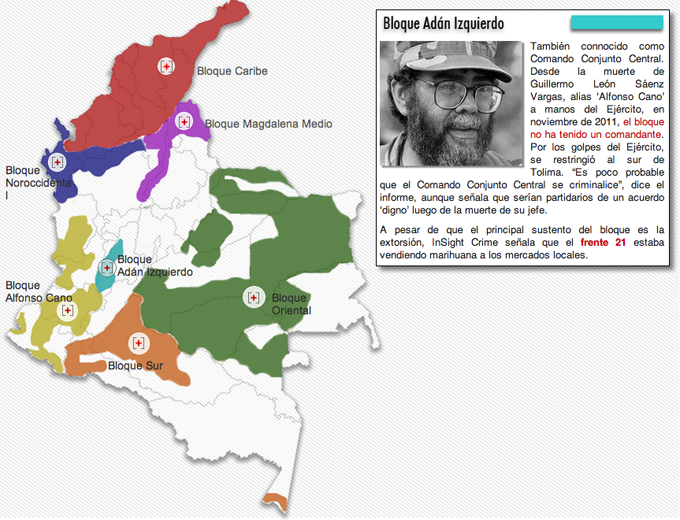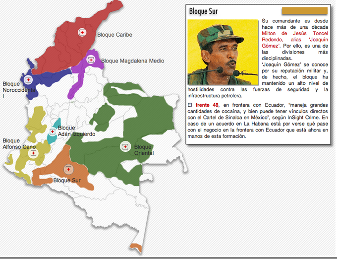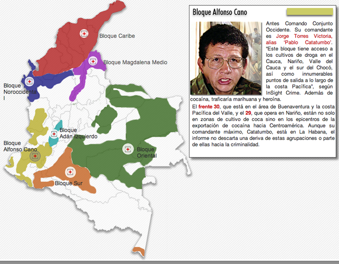 “Ha habido reportes de relaciones entre las FARC y las BACRIM en Antioquia, Cauca, Caquetá, Chocó, Córdoba (el ejército capturó juntos a miembros de los Urabeños y a un emisario del Frente 58 de las FARC en un laboratorio de drogas), Nariño, Norte de Santander, Meta, Putumayo y Valle del Cauca”, explica InSight Crime.