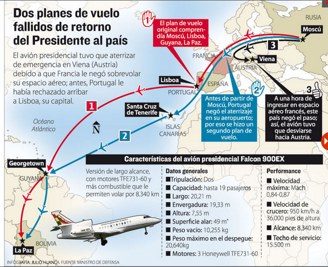 banner_La_Razon_BOPortugal le revocó el permiso de aterrizaje; España, Francia e Italia le negaron tránsito aéreo por sus territorios. Nunca Evo Morales sufrió negativa similar, calificado por el Gobierno como un “atentado” a la vida del Mandatario y un acto de discriminación. Morales participó del Foro de Países Exportadores del Gas, en Rusia. Tenía planificado volver a La Paz con dos escalas técnicas; una en Lisboa y otra en Guyana.