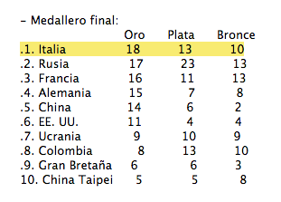 Rusia, por su parte, debió resignarse con la segunda posición, con tan solo una medalla de oro menos que Italia, mientras que de plata sumó 23 y de bronce 13, para un total de 53.