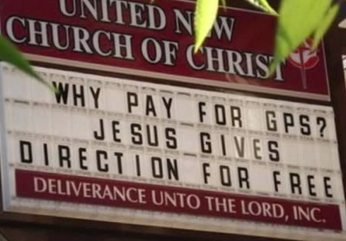 “perché pagare un GPS?Gesù ti indica la strada gratis”. Un annuncio piuttosto da nerd quello di questa chiesa americana che cerca di attrarre fedeli.