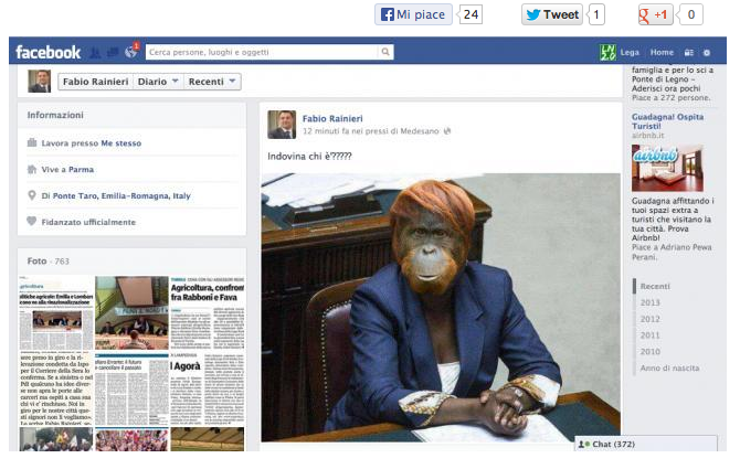 La foto della pagina Facebook di Fabio Rainieri, segretario della Lega Nord Emilia e deputato della scorsa legislatura, che ieri ha postato questo fotomontaggio contro la Kyenge. E’ stato sommerso di critiche ma è dovuto intervenire Maroni per convincerlo a togliere tutto quanto. Il post, tuttavia, è rimasto diverse ore sulla sua bacheca, è stato condiviso e anche parecchio commentato.