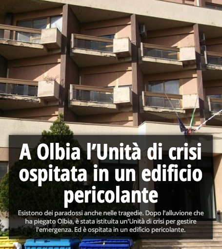 sardinia postEsistono dei paradossi anche nelle tragedie. Da quasi due settimane, dopo che quel terribile 18 novembre l’alluvione ha piegato Olbia, è stata istituita un’Unità di crisi per gestire l’emergenza. Quello che tecnicamente è chiamato il Ccs, Centro di coordinamento soccorsi, per uno strano scherzo del destino è ospitato in un palazzo pericolante. Proprio così, il cuore operativo che ospita la task force che gestisce l’emergenza di Olbia e della Gallura, che ha visto sfilare i profili più influenti della politica italiana, dal presidente del Consiglio al ministro della Difesa, che ha ospitato il Capo della Protezione civile, sarebbe dasgomberare immediatamente. Il centro operativo da evacuare. Una beffa che va spiegata.
