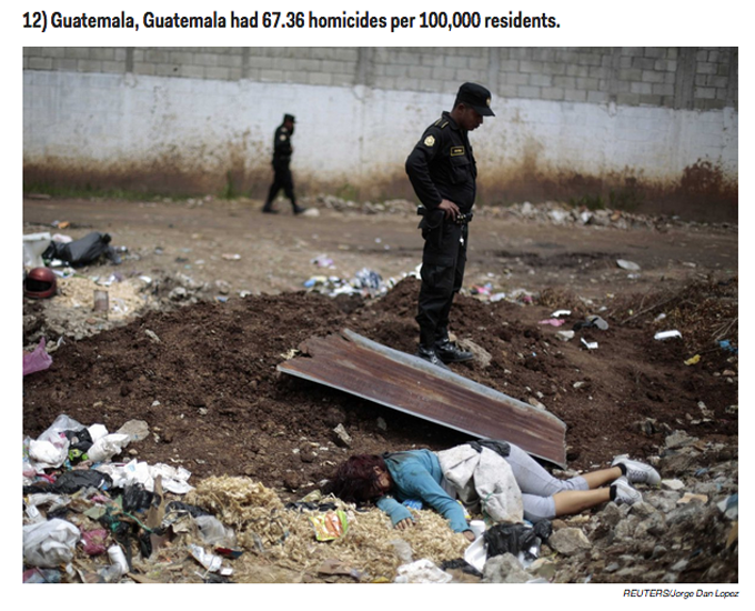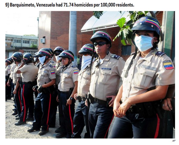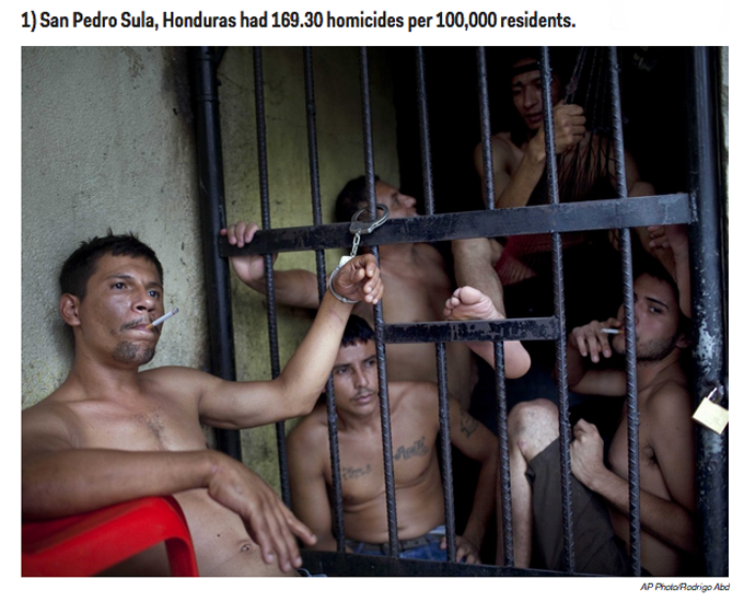 La classifica si basa sui dati del 2012, fatta eccezione per San Pedro Sula e Distrito Central in Honduras , dove le autorità non hanno collaborato e sono stati utilizzati dati del 2011.