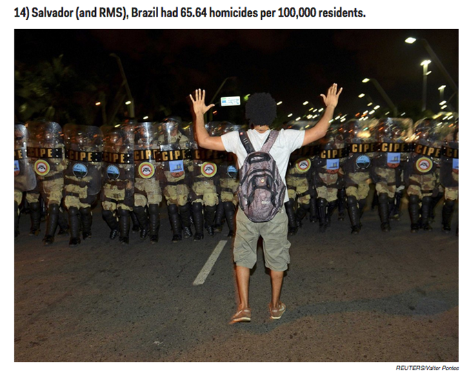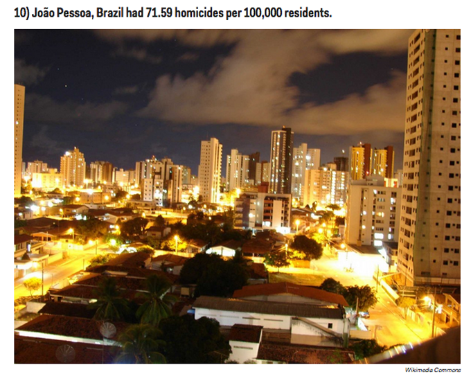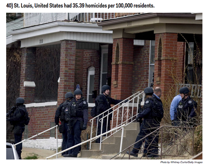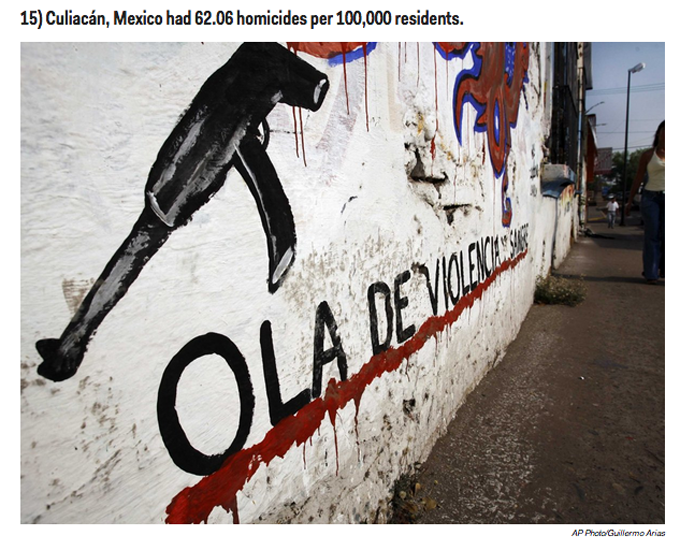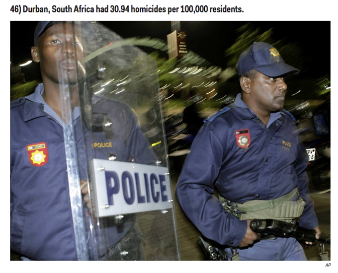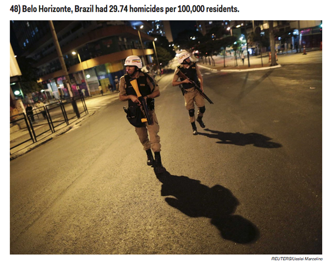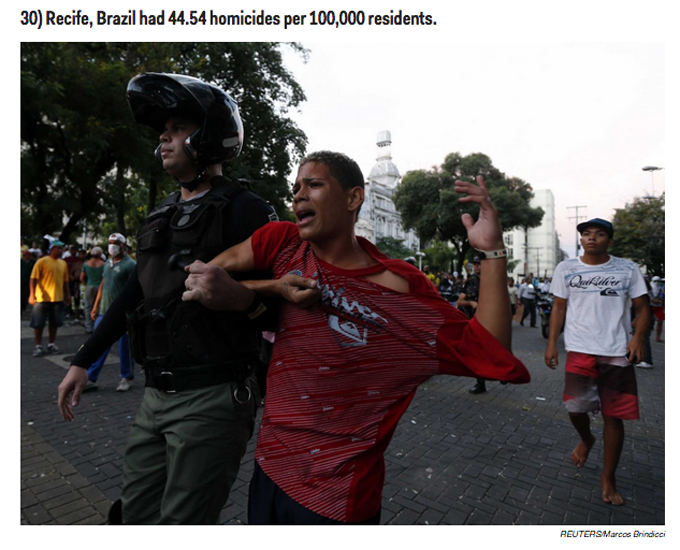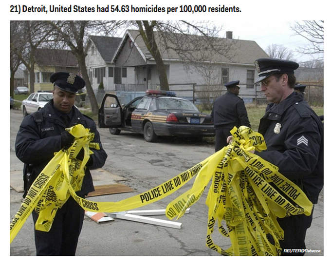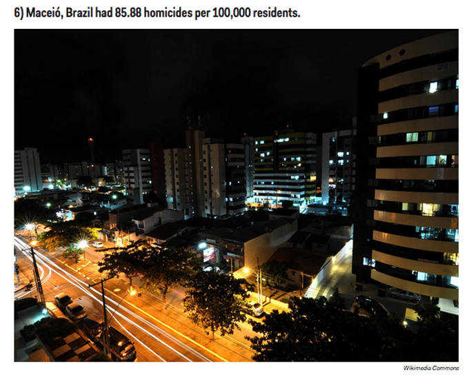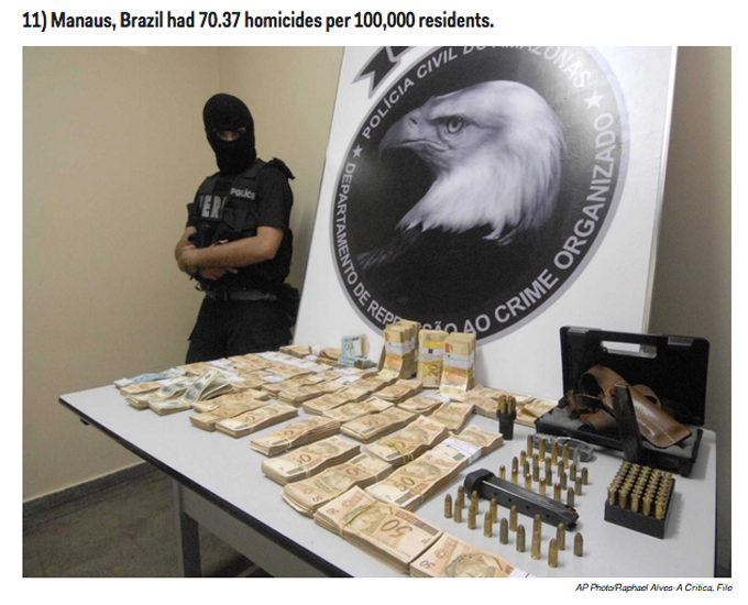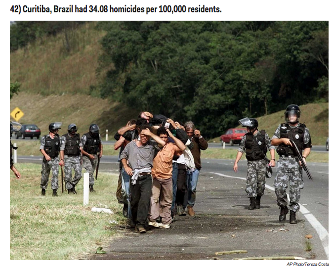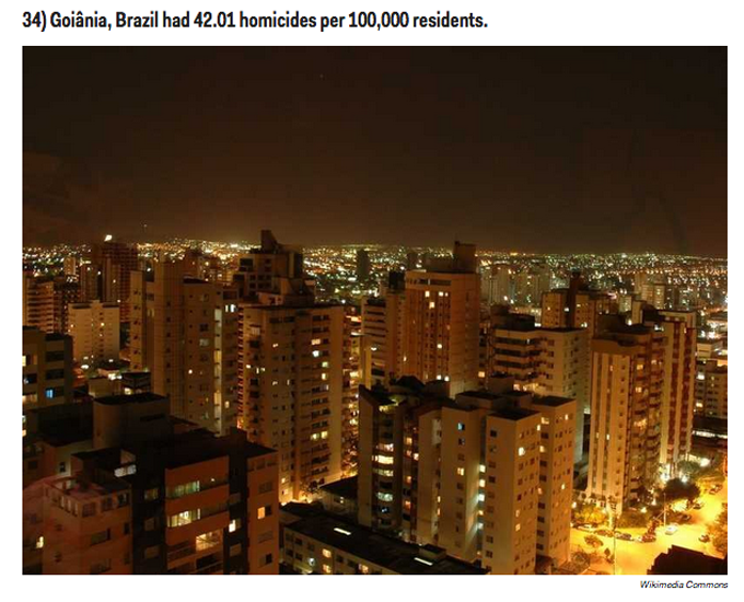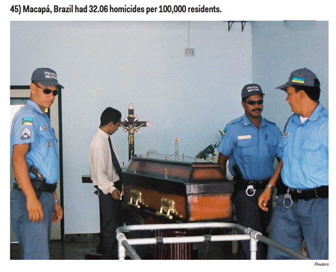 41 delle prime 50 città più pericolose si trovano in America Latina ma sono presenti anche alcune città statunitensi come New Orleans, Detroit, St. Louis, Baltimora e Oakland.