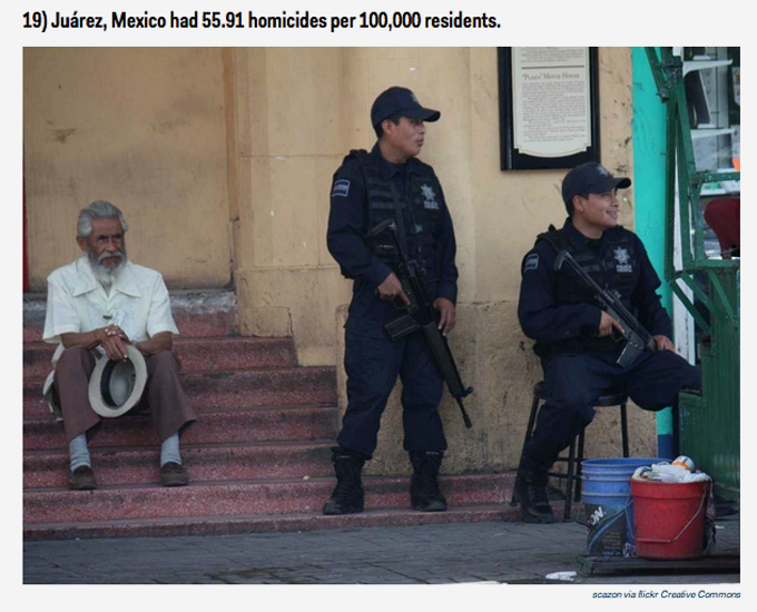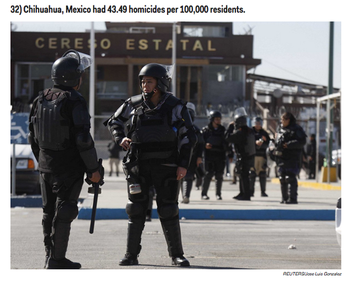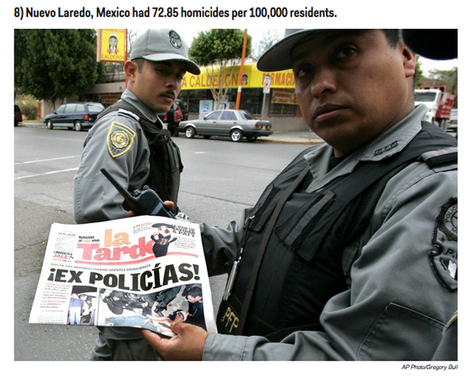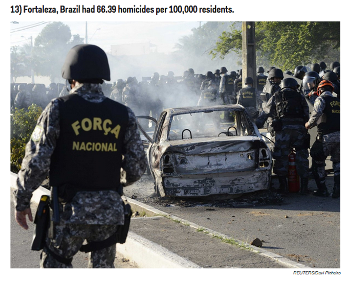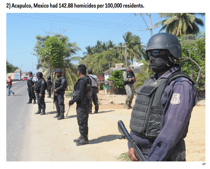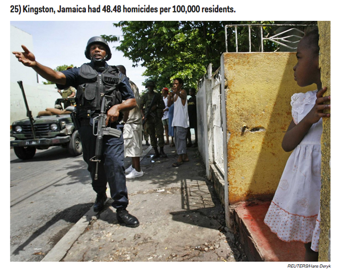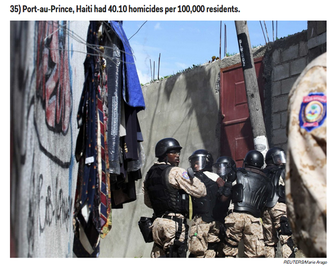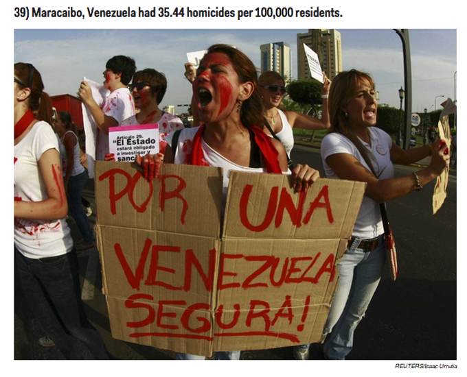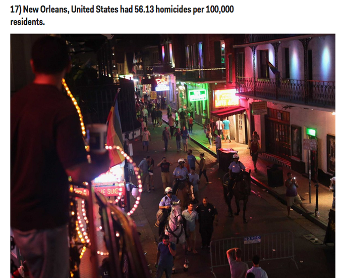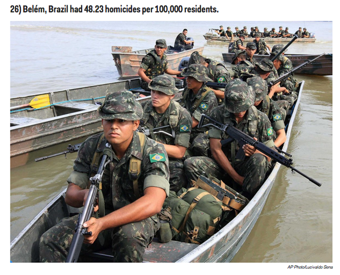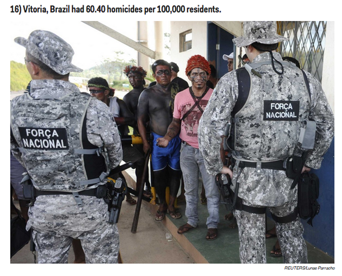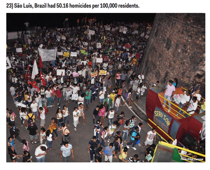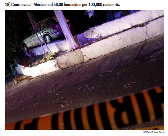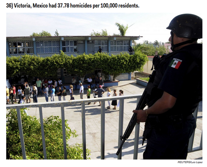 41 delle prime 50 città più pericolose si trovano in America Latina ma sono presenti anche alcune città statunitensi come New Orleans, Detroit, St. Louis, Baltimora e Oakland.