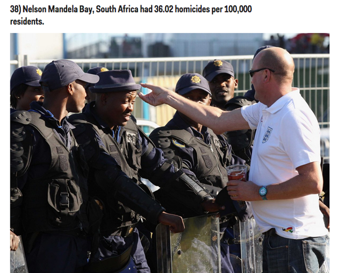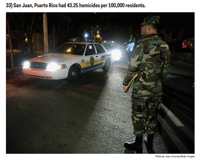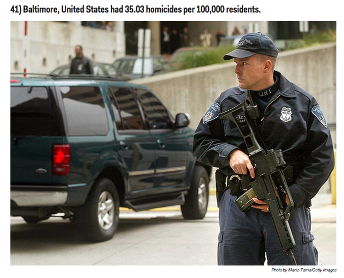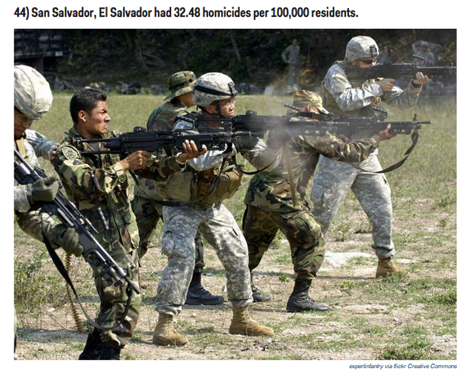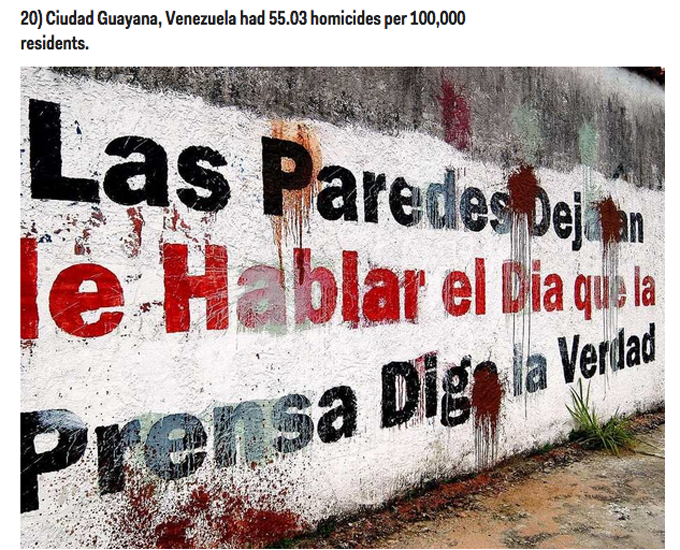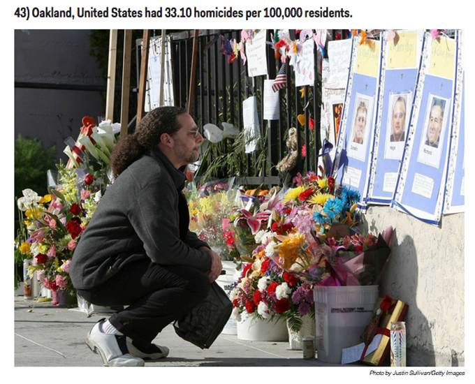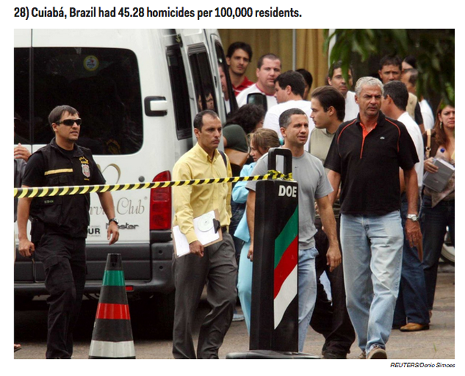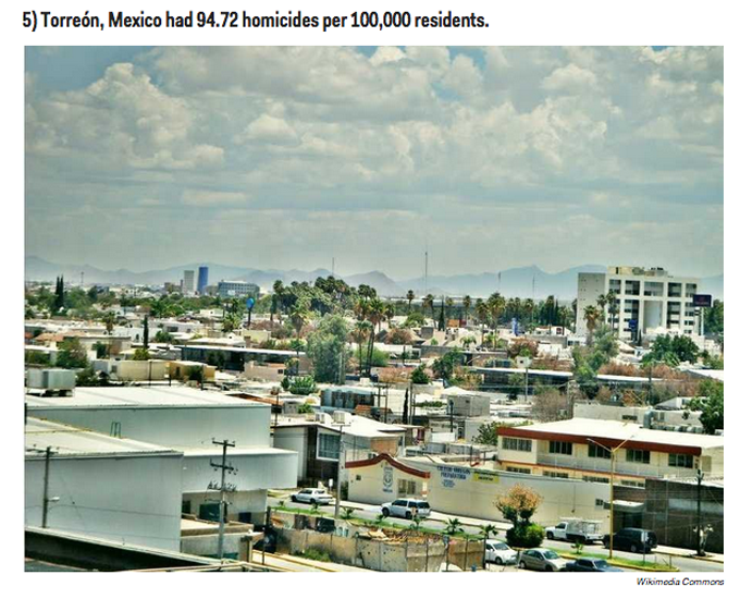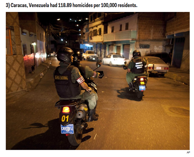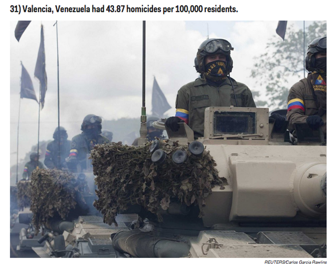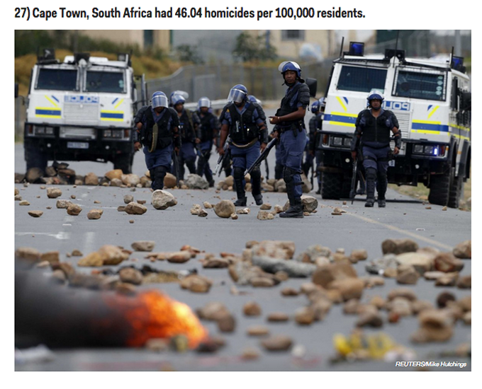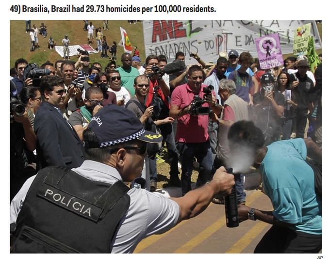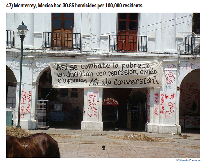 41 delle prime 50 città più pericolose si trovano in America Latina ma sono presenti anche alcune città statunitensi come New Orleans, Detroit, St. Louis, Baltimora e Oakland.