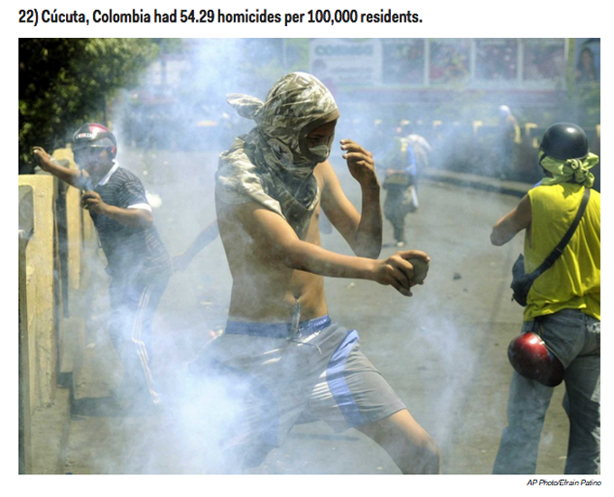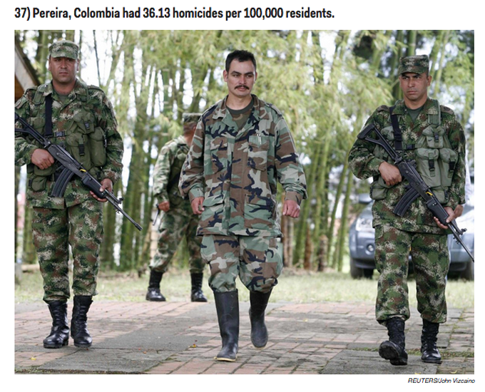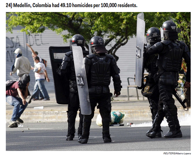 Lo studio accurato mette in cima alle città più violente al mondo San Pedro Sula in Honduras, città nella costa atlantica di circa mezzo milione di abitanti. La prima città più violenta in Colombia è Cali (Santiago de Cali)  nel distretto di Valle de Cauca con 2,5 milioni di abitanti è collocata al settimo posto nel mondo nella macabra classifica