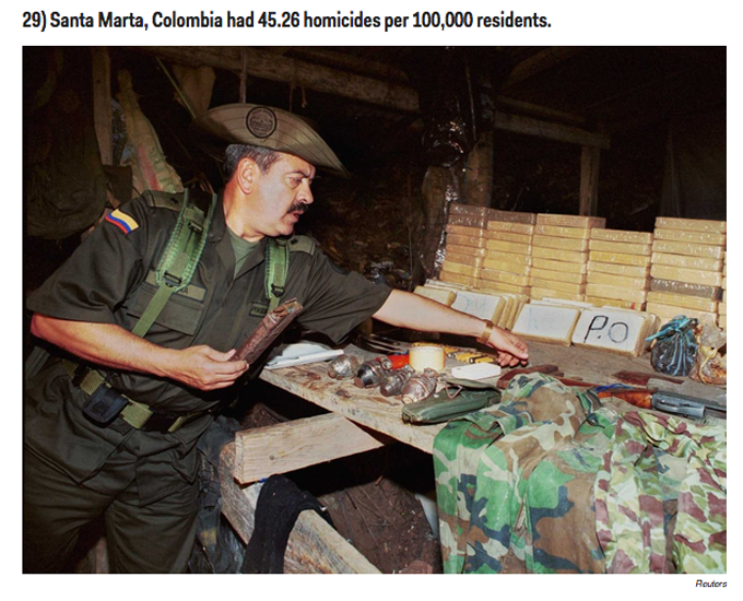 Al secondo posto in Colombia c’è Cúcuta, (nella classifica mondiale 22esima), Medellín è la terzo ed è al 24esimo nel mondo, Santa Marta al quarto posto, Pereira al quinto posto e al 37esimo posto nel mondo