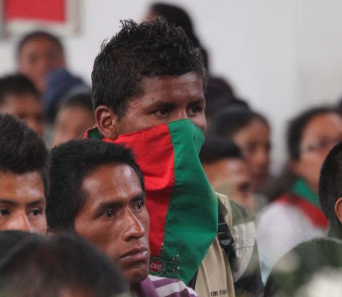 Daniel Coicué e Manuel Antonio Tumiñá, sono i due indigeni, civili, volutamente assassinati. Facevano parte della “Guardias Indígenas” , la dinamica dell’omicidio vede le due parti contrapporsi su uno striscione che celebrava l’anniversario dell’uccisione di Alfonso Cano – capo carismatico delle Farc-EP – da parte dell’esercito Colombiano ucciso nel novembre del 2011, la Guardias Indígenas si oppone affinchè lo striscione venga esposto, gli indigeni rivendicano la loro totale neutralità al conflitto e da anni si battono affinchè questa neutralità venga riconosciuta da entrambe le parti, esercito e guerriglia. Quello che succede nell’immediato è che i mitra dei guerriglieri fanno fuoco sugli indigeni disarmati, e, a perdere la vita sono un leader e un membro della Guardias Indígenas. Subito si mobilità la comunità, scatta la caccia al “guerrigliero”, ne vengono catturati cinque e questa mattina, in una scuola pubblica, verranno processati, rischiano tutti e cinque il massimo della pena, 35 anni di prigione. Il Pueblo processa cinque “prottettori” del Pueblo, anacronistico? No, totalmente reale.