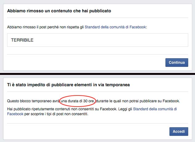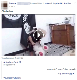 Il grande censore, questa volta, ha potuto così notare “casualmente”, che avevo postato un video, da me presentato come “TERRIBILE”, di un bambino che indossando indumenti riconducibili al gruppo Is, il famigerato gruppo terroristico islamista attivo in Siria e Iraq, con un coltellaccio mimava lo sgozzamento e il taglio della testa del suo orsacchiotto bianco. Secondo facebook che ha rimosso il filmato, io non avrei rispettato gli Standard della comunità di facebook e perciò vengo per l’ennesima volta “bloccato” in via temporanea per 30 ore, che l’indomani diventano provvidenzialmente 30 giorni.