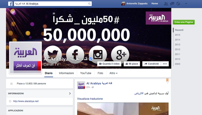 Certo, i miei 5000 mila “seguaci” non sono niente in confronto ai 13 milioni della televisione Araba, che conta per la verità 50 milioni di mi piace tra facebook, twitter, instagram e g+, tanto da annunciarlo, con orgoglio maniacale, sulla sua stessa pagina di facebook.