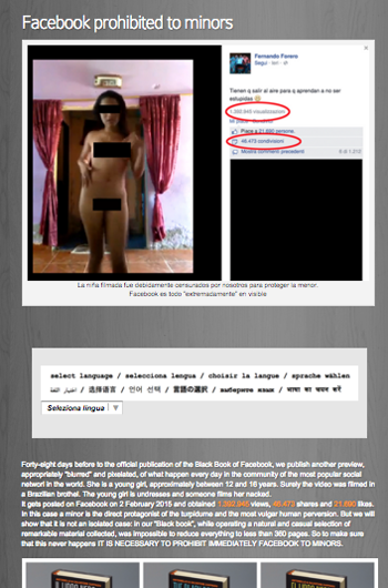 Parliamo di un pamphlet di denuncia sugli orrori cui i nostri ragazzi “minori”, possono imbattersi ogni giorno dentro le pagine di Facebook. Orrori che, in termini telegrafici, ti sintetizzo: pedofilia, uccisioni, esecuzioni, decapitazioni, torture, pornografia, cannibalismo, suicidi, violenza sui bambini, sadomasochismo, zooerastia – rapporti sessuali con cani, gatti, pesci, e pensa un po’ anche con una pitonessa – e quant’altro di osceno ed inimmaginabile si possa trovare in una “galleria dell’inferno umano”.