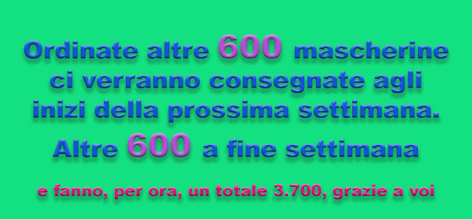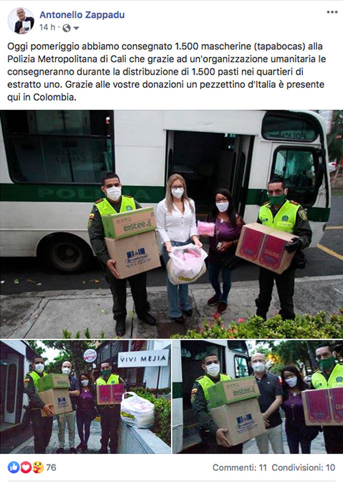 | Vi avevo promesso di relazionarvi quello che Susan ed io stiamo facendo con le donazioni ricevute. Abbiamo, ad oggi raccolto 621,89 euro. Abbiamo ordinato 2.500 mascherine e ne abbiamo ricevuto in questo momento 2.140, le altre 360 arriveranno prima del prossimo giovedì 14 maggio. Il prezzo che siamo riuscito ad ottenere, per ogni mascherina del tipo infermieristico, è di 0,21 euro (iva e trasporto incluso), per un valore totale di € 525,00. Abbiamo distribuito a mano, in due giorni, presso il centro di Cali, nella zona amministrativa, per intenderci intorno al CAM, 290 mascherine. Ieri avremo dovuto consegnare ad una organizzazione Umanitaria che collabora con la Polizia Metropolitana di Cali il rimanente di 1.850 mascherine ma per un inconveniente, a noi sconosciuto, siamo stati costretti a rinviare la consegna a domani lunedì 11 maggio… Vi terrò informati. UN GRANDE GRAZIE. Santiago de Cali, 10 maggio 2020 H. 11:32 |